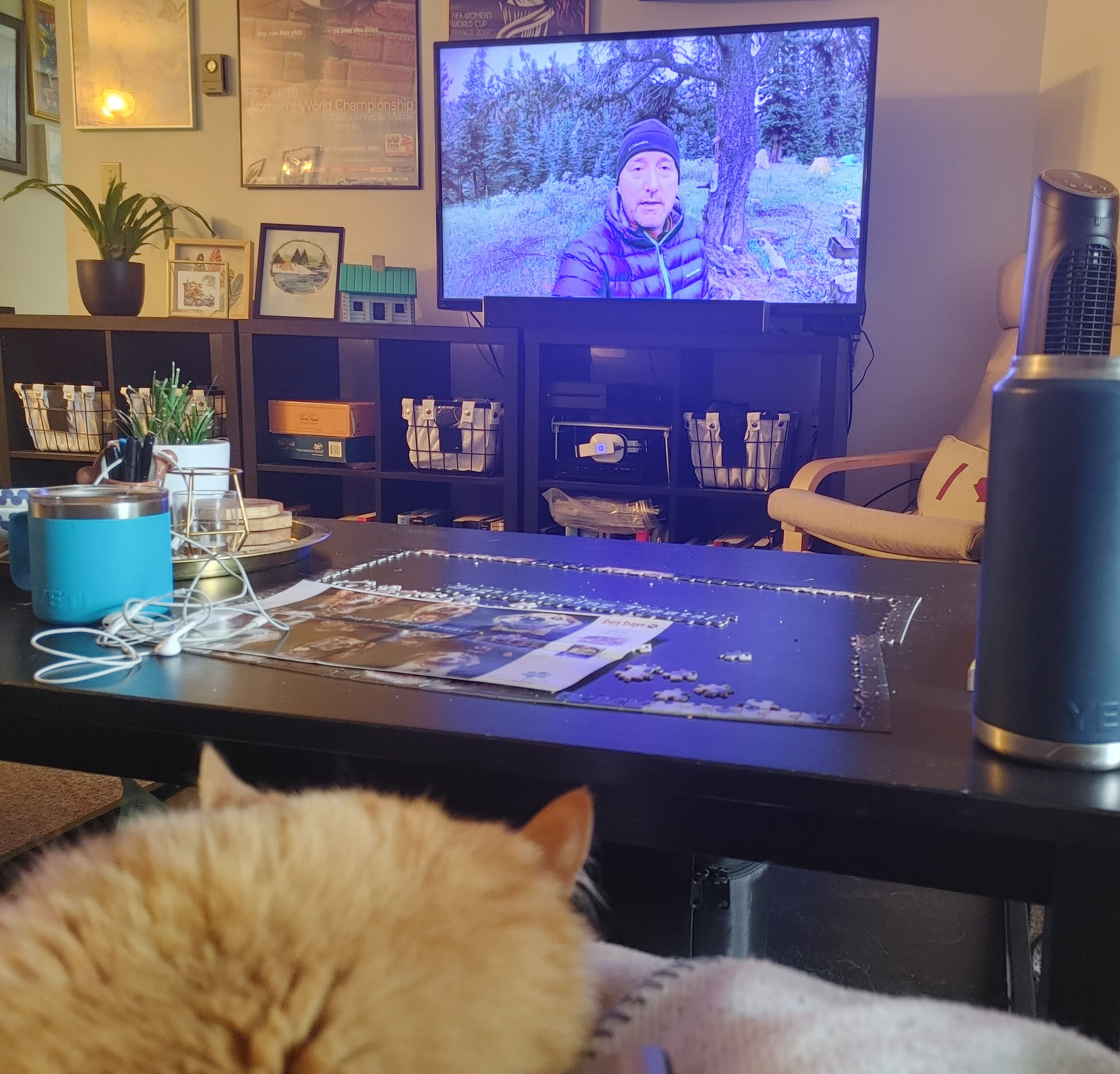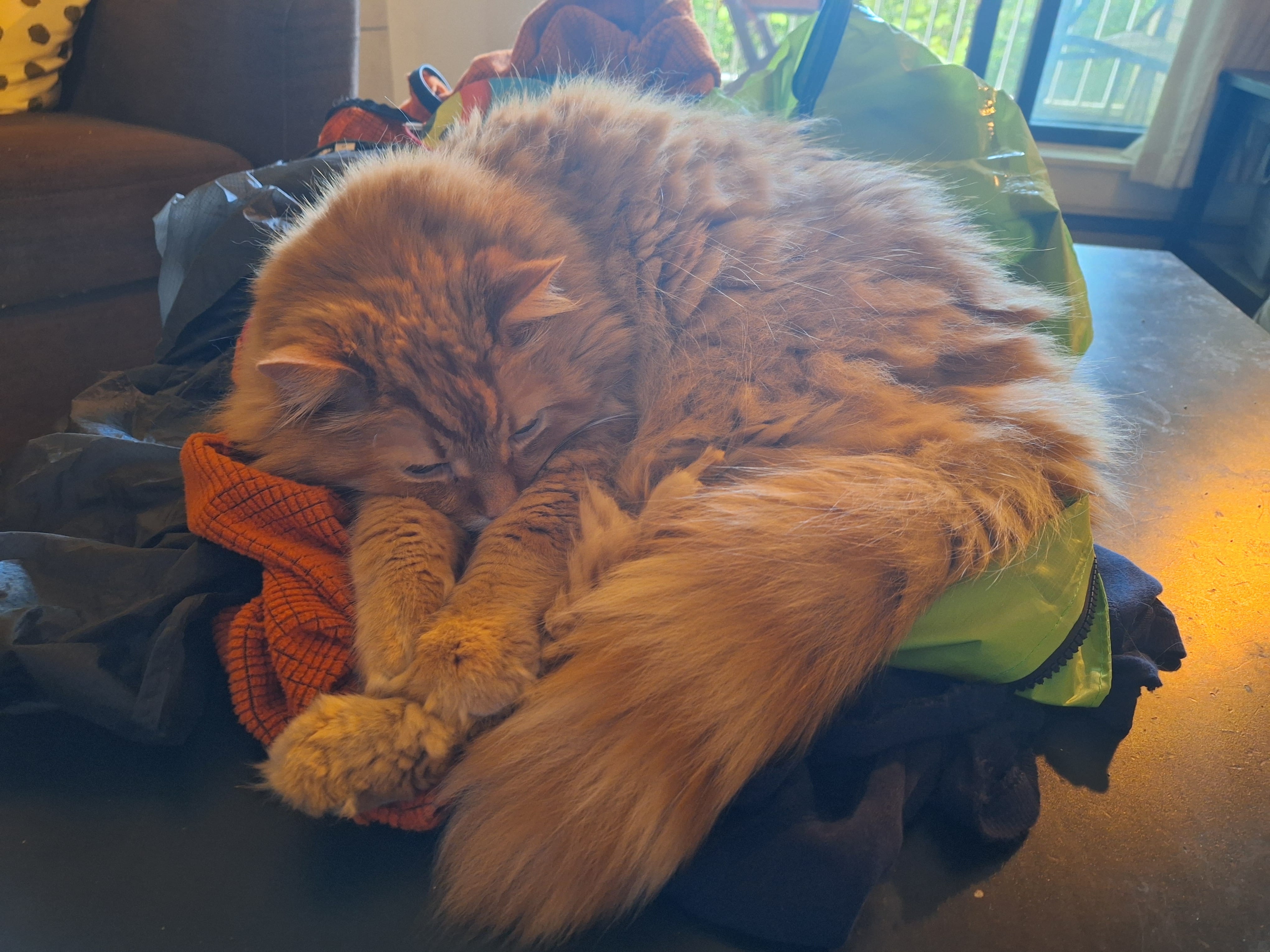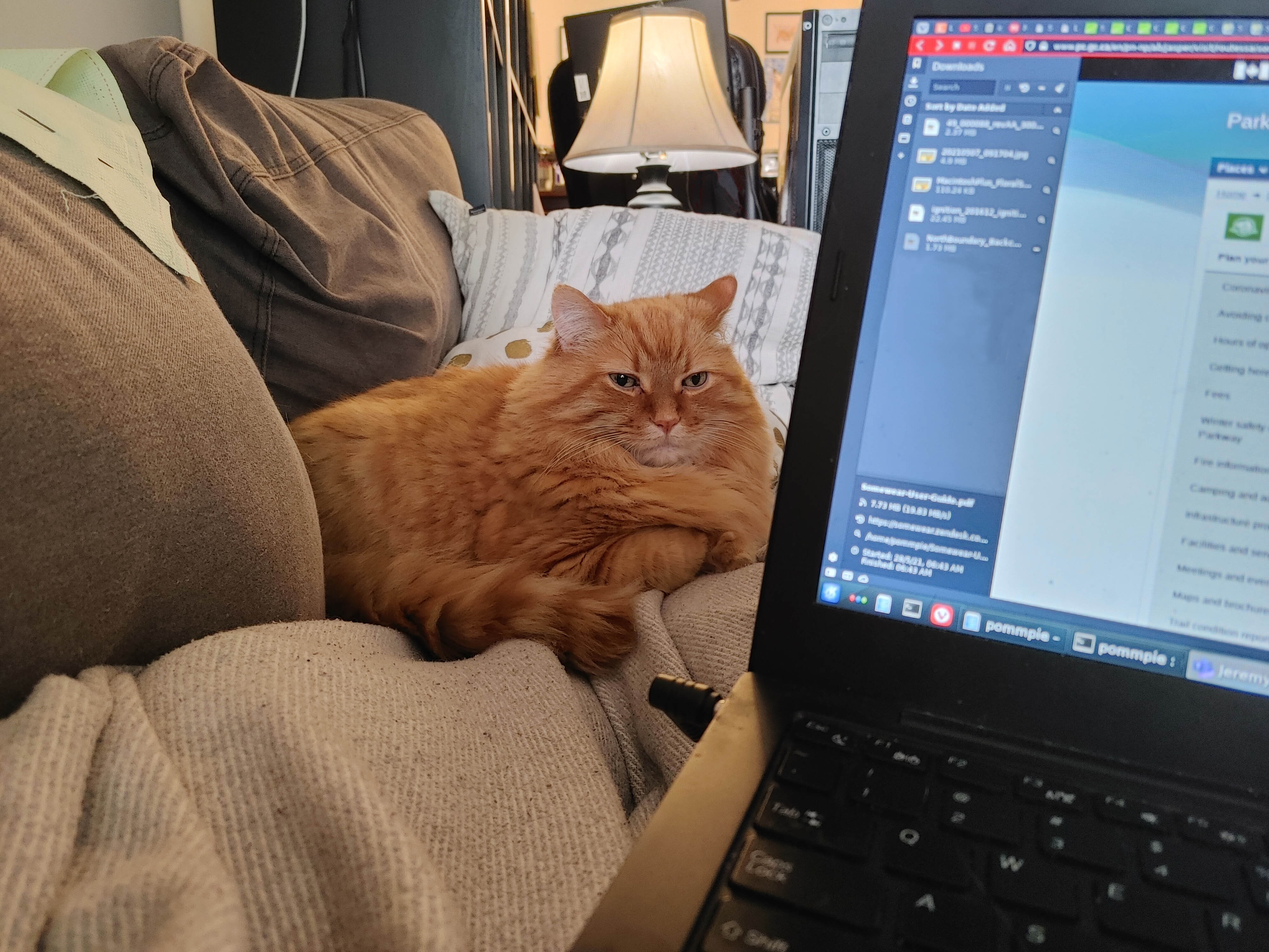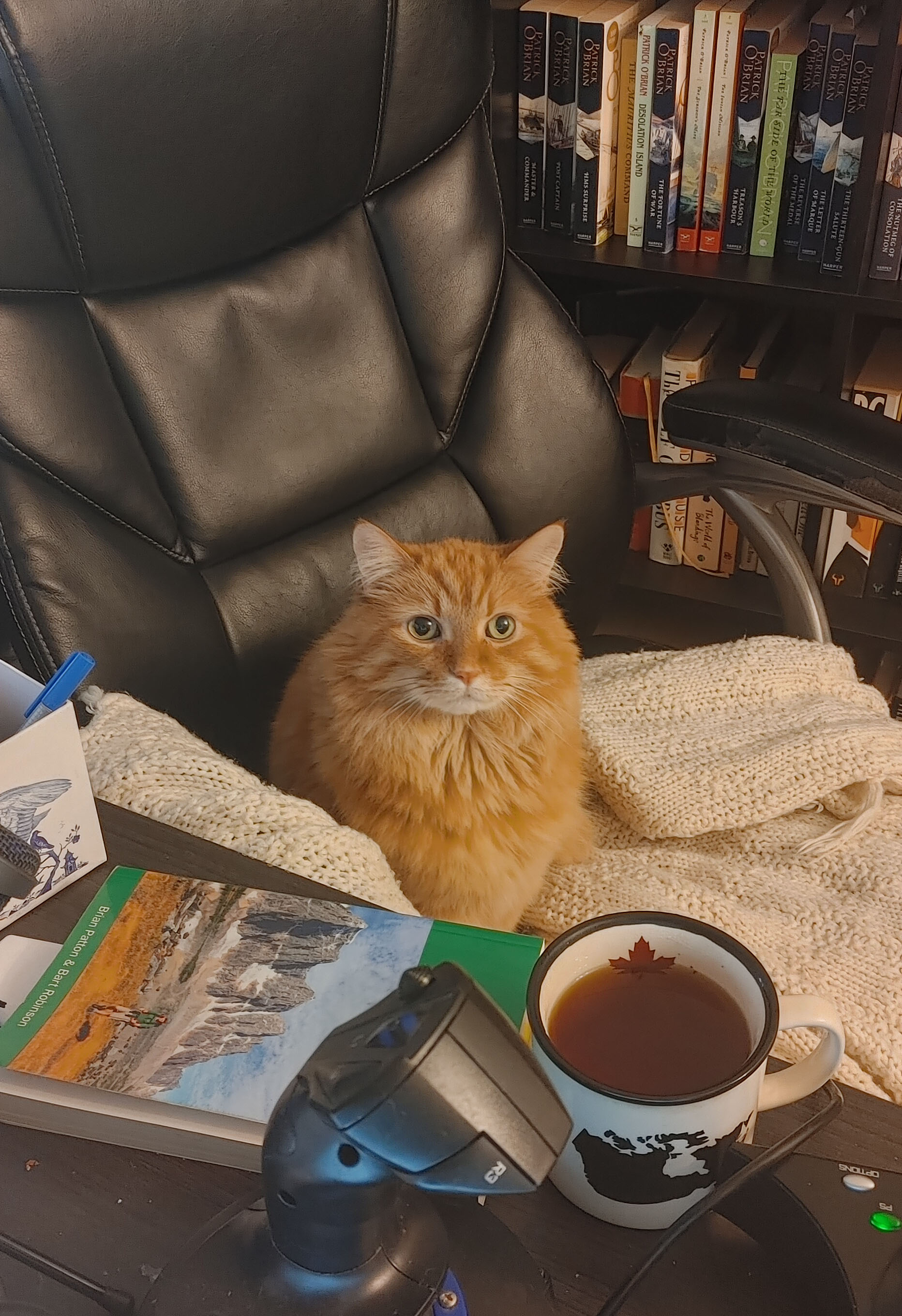 The creeks push responsible hiking on the North Boundary out to September, when water levels come down. September was also the worst month for the only person I trusted to look after my cat. Presley was a cancer-stricken, cantankerous kitty who was affectionate with me, and only after the fact did I realize how close he’d been while I dreamed of the North Boundary. A photo of Presley watching Stuart Howe’s North Boundary Trail video; him hanging out as I hit Jasper’s backcountry trail website. One of my favourite photos is Presley stealing my chair in front of a copy of the Canadian Rockies Trail Guide. He was never a camping cat, but always a part of it, even if just by cuddling on my gear so orange fur would cling to everything.
